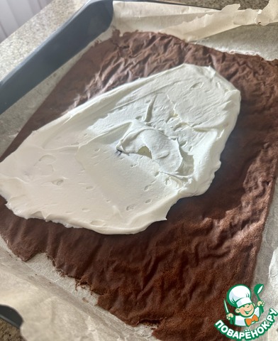 Лист пергамента присыпал сахарной пудрой. Слегка. И выложил бисквит «лицом» на эту присыпанную бумаг