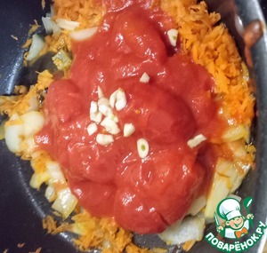 Добавить томаты, томатную пасту, чеснок, копчёную. паприку, сахар, соль и перец.