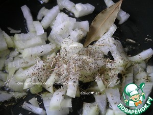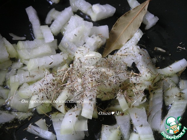 Нагрейте в кастрюльке на среднем огне 2 ст. л. оливкового масла. Пассеруйте лук с лавровым листом и чабрецом.