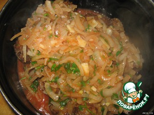 Добавляем томатный сок (или разведённую томатную пасту, или свежие помидоры) и кинзу. Солим и перчим - по вкусу.