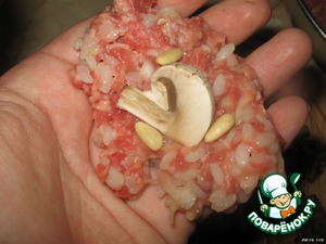Лепим тефтельки. В каждую кладём кусочек шампиньона (их нужно нарезать дольками) и несколько ядрышек кедрового ореха.