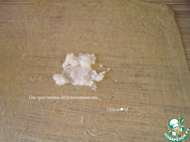 Аккуратно начните сворачивать в плотный рулет, промазывая каждый оборот смальцем.