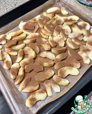 Застелил противень пергаментом. Смазал его слегка сливочным маслом и яблоки ровным слоем на пергамент выложил.
