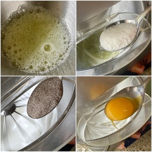 И как только сахар хорошо размешался, увеличил скорость миксера и стал смесь взбивать.