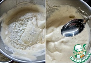 Потом добавил вторую половину муки и опят таки, очень аккуратно, чтобы смесь не осела, перемешал.