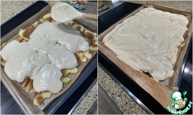Выложил тесто на яблоки и разровнял.