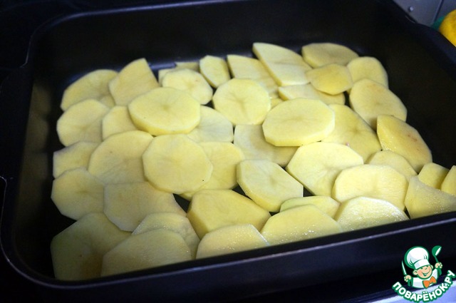 Картошку порезать шайбами. Противень смазать маслом, уложить картошку внахлест. Слегка посолить.