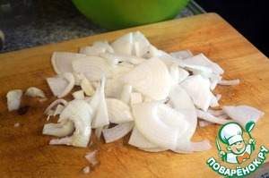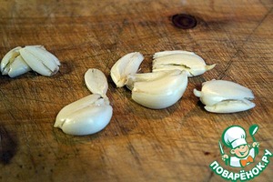 Зубчики чеснока слегка раздавить ножом и разрезать каждый на две-три части.