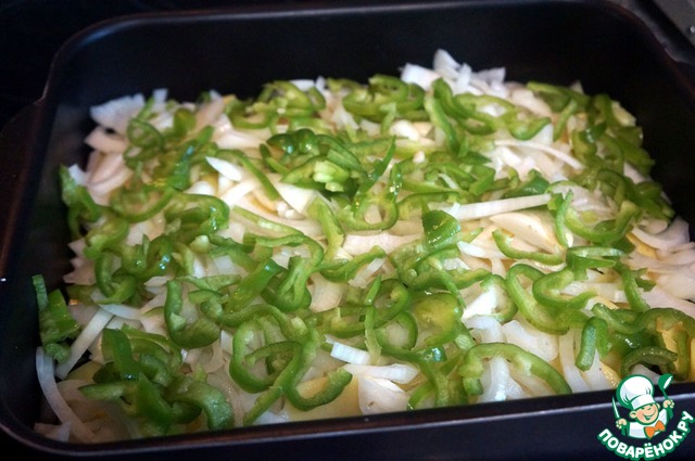 Перец освободить от семян и перегородок, порезать полукольцами.