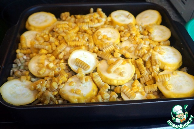 Рассыпать зерна кукурузы. Овощи посолить. Можно солить отдельно каждый слой, но есть риск переборщить.