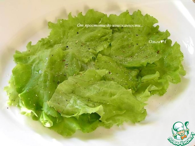 Листья салата порвите руками, разложите по тарелкам, присыпьте солью и смесью перцев.