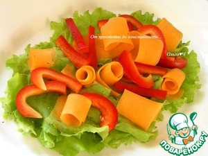 Морковь нарежьте с помощью овощечистки, по желанию заверните в колечки и выложите сверху. Добавьте перец, нарезанный брусочками.