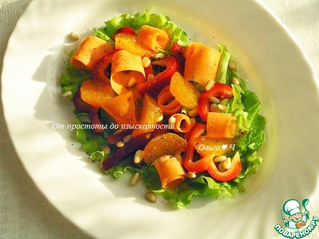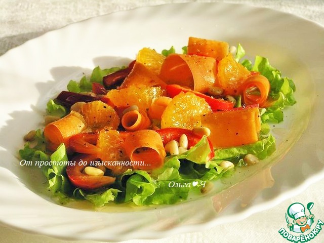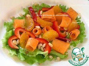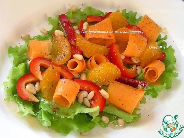 Салат из моркови и сладкого перца с мандаринами и кедровыми орешками в интересной заправке. Яркий, сочный и витаминный салат. Попробуйте!