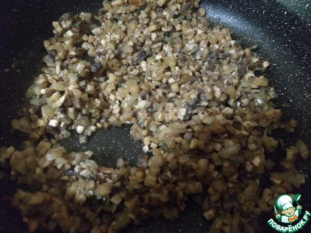 Приготовить начинку. Лук спассеровать на растительном масле. Добавить грибы, порезанные мелким кубиком, сушёный чеснок, соль, перец. Обжарить всё вместе до готовности. Сыр натереть отдельно на мелкой тёрке.