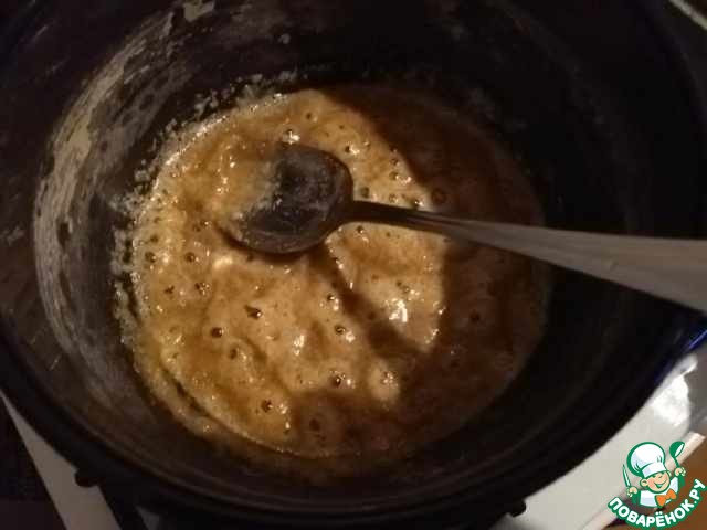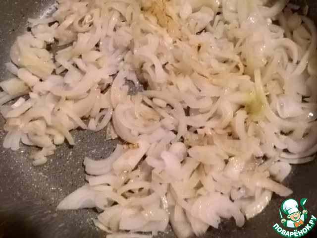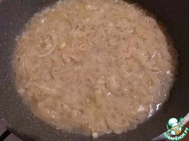 К луку подлить воды и тушить дальше, пока вода не испарится, и не начнёт снова жариться лук. Повторить процедуру 2 раза.