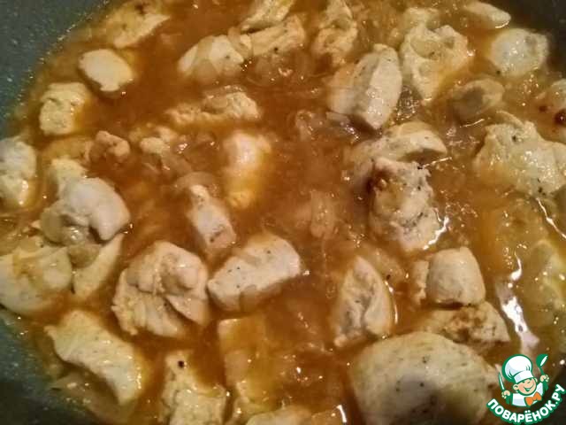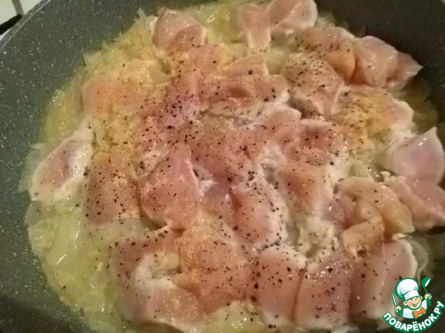 Курицу нарезать средними кусочками, выложить на луковую массу, не солить, добавить чеснок и перец.
