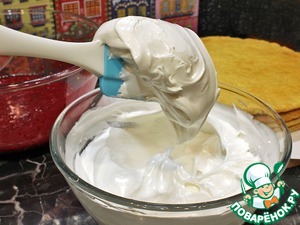 Для прослойки коржей используем крем «Мокрое безе». Я не буду рассказывать, как его сделать, все хорошо описано в рецепте, который уже есть на сайте.
