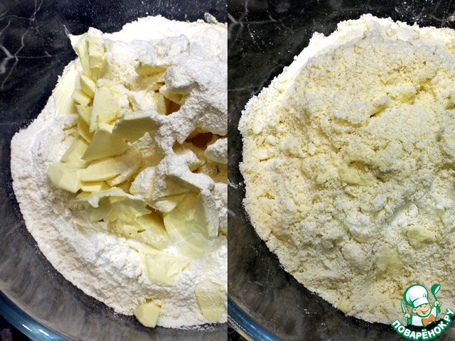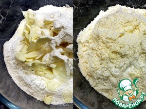 Нужно просеять муку и поверх нее настрогать ножом холодное сливочное масло. Кончиками пальцев перетрите масло с мукой. Сделайте это по возможности быстро, масло не должно растаять. Можно использовать миксер с насадкой «крючки». Не надо добиваться однородности смеси, маленькие комочки масла допустимы, и даже приветствуются. -