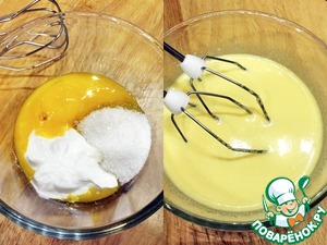 Разделите яйца на желтки и белки. Для теста нужны только желтки, белки понадобятся для крема. Смешайте желтки с сахаром, ванильным сахаром и сметаной. Разотрите миксером (на малых оборотах), в конце добавьте соль и соду.