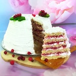 Крем разделите на три части и намажьте каждый корж, кроме одного. Клюквенное пюре также разделите на три части и распределите сверху на креме, немного не доходя до края коржа. Установите нижний корж на блюдо или круглую доску, и сложите коржи один на другой. Придавливать не надо. Чистый корж должен быть сверху. Чтобы торт получился ровным и не «уплыл» в сторону, наденьте на него разъемное кольцо от формы. Если кольцо не застегнется, не страшно. Оставьте пропитаться на ночь.