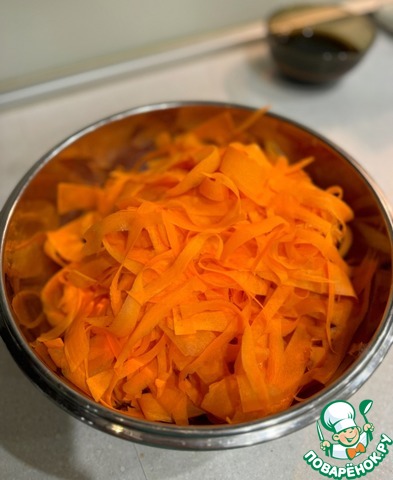 С помощью овощечистки нарезать морковь очень тонкими слайсами