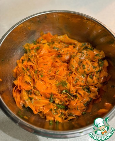 Морковь соединить с заправкой, добавить свежий укроп. Все перемешать. Убрать в холодильник минимум на один час