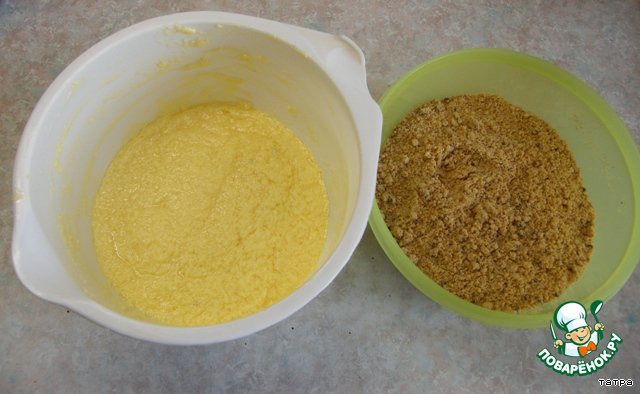 • Масло взбиваем до пышной консистенции.Яйца растераем с сахаром добела,смешать со взбитым маслом.Во время смешивания я переодически прогревала в микроволновке,т.к к сырым яйцам отношусь очень негативно.