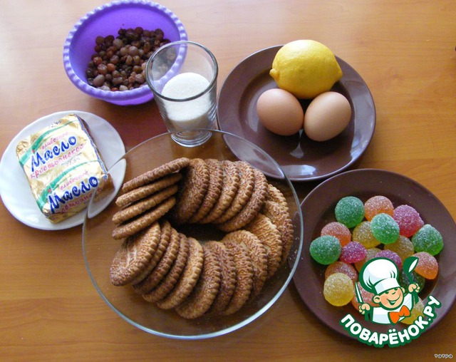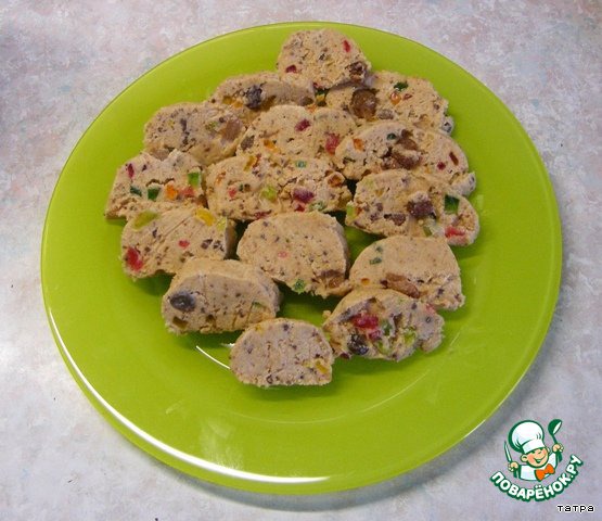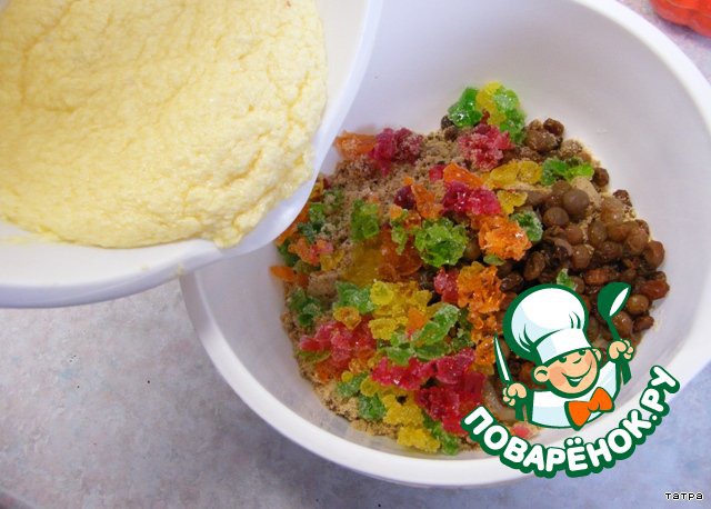 • Изюм,мармелад,печенье и цедру соединить с яично-маслянной смесью и хорошо перемешать.