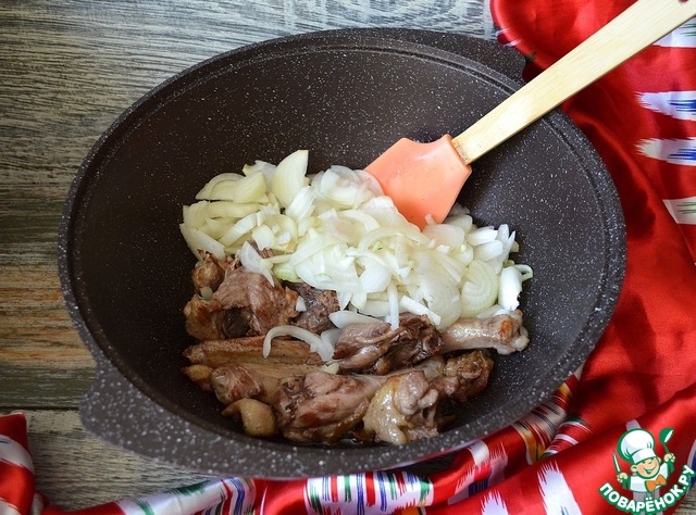 В казане хорошо разогреть растительное масло, убавить огонь до среднего, обжарить в масле куски утки. Добавить нарезанный репчатый лук, жарить 5-7 минут на среднем огне.