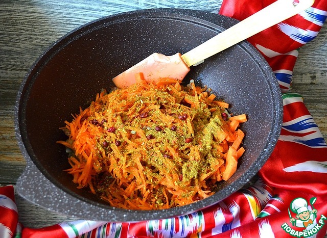 Подготовить морковь - половину нарезать брусками, половину натереть на крупной терке. Добавить всю морковь, специи и барбарис, перемешать, жарить 5-7 минут, огонь чуть выше среднего.