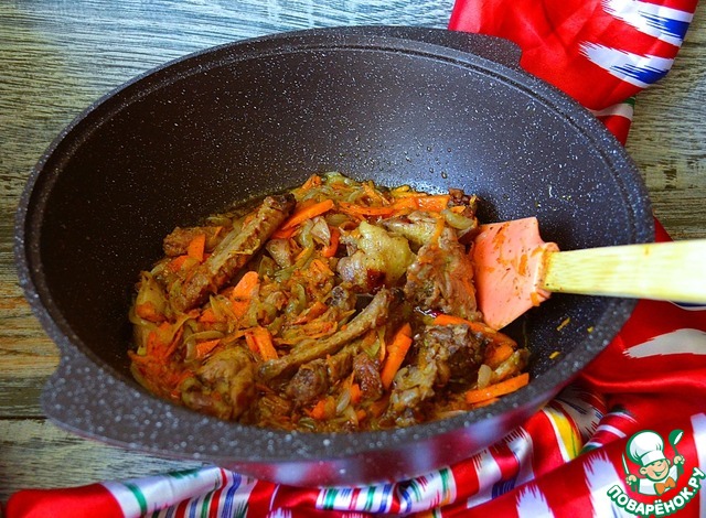 Влить 1 стакан кипятка, слегка посолить, тушить зирвак 20 минут.