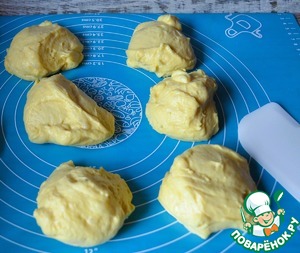 Выбродившее тесто разделить на 6 одинаковых частей. Подкатать в колобки, накрыть, дать 10 минут отдохнуть.