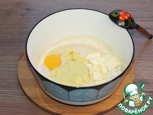 12. Приготовим тесто. К опаре добавляем картофельное пюре (110 гр), теплое молоко, мягкое сливочное масло (60 гр), 1 желток и соль. Перемешиваем и измельчаем блендером до образования однородной жидкой массы.