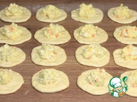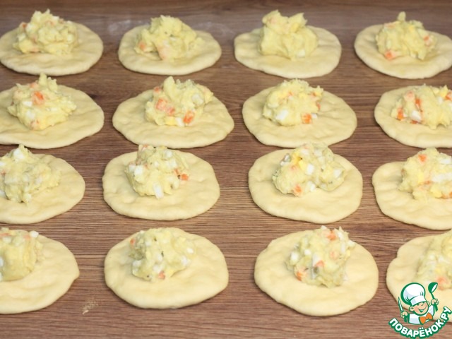 19. Расплющиваем каждую часть теста в лепешку и кладем начинку.