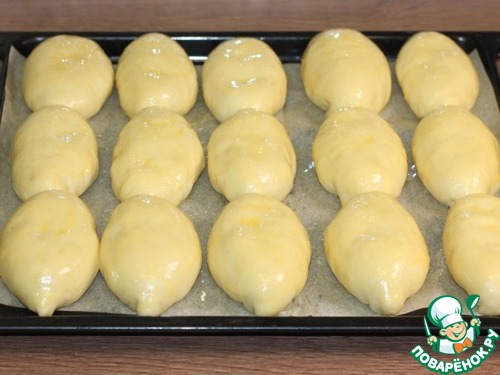 21. Выкладываем пирожки на противень, застеленный бумагой и смазанной маслом. Накрываем пленкой или полотенцем и убираем в теплое место до увеличения пирожков в 2 раза.