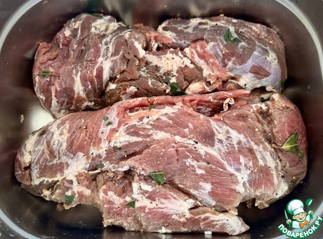 И мясу надо дать вылежаться. Проветриться, что называется. Созреть. При комнатной температуре. Это еще надо для того, чтобы нитритная соль полностью провзаимодействовала с мясом. Минимум часов шесть пусть лежит.