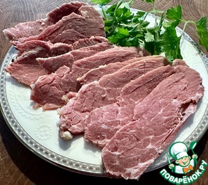 Что в этих ломтях от ростбифа? Разве только именно нарезка ломтями готового мяса. Ведь всем понятно и известно, что традиционный английский ростбиф готовят из говядины – это раз. И на финишном этапе мясо запекают в духовке – это два. А у меня, во-первых - лопатка поросёнкина. Во-вторых, су вид вместо духовки. Так что, скорее приготовил я что-то типа варено …, но не копченного бекона. А так как лопатка, ну т. е. мясо практически чисто постное, то пусть будет «свино-беконовый» ростбиф.