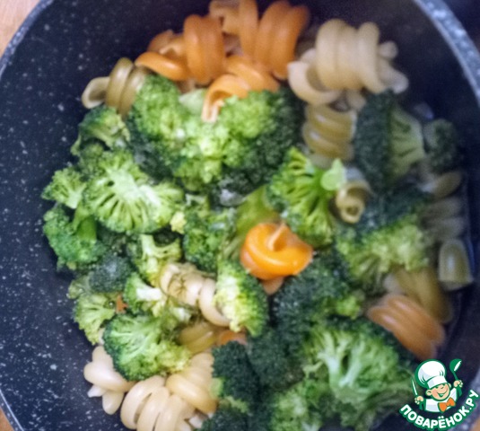 В кипящей воде варить пасту 9 минут, затем добавить брокколи и готовить ещё 4 минуты. Убрать с огня, процедить, сохранив 100 мл накрахмаленной воды.