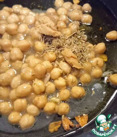 Тем временем, в глубокой ёмкости разогреть масло и жарить чеснок одну минуту. Затем добавить мисо-пасту (или анчоусы), зиру и лимонный сок. Жарить ещё минуты 2, постоянно помешивая. В конце добавить нут, красный жгучий перец, черный перец и убрать с огня.
