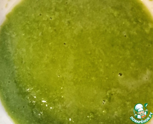Разморозить 100г зелёного горошка в микроволновке. ( 3 минуты). Затем пробить блендером, превращая горох в пюре.