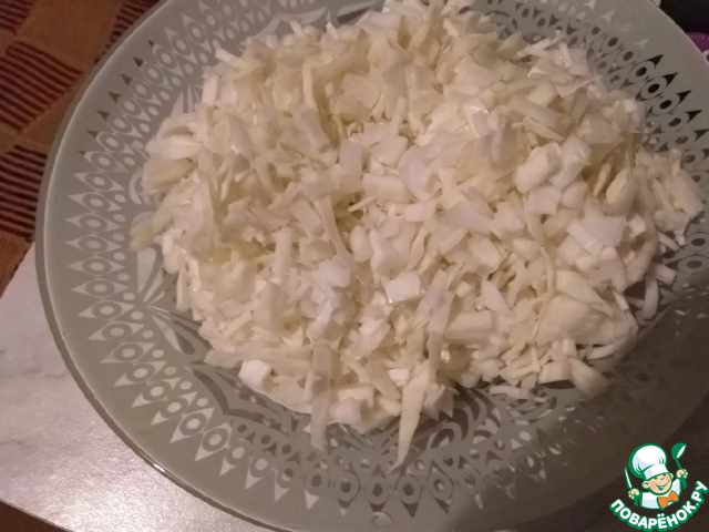 Капусту нарезать тонкой соломкой, проварить в подсоленной воде 5 минут, откинуть на дуршлаг.
