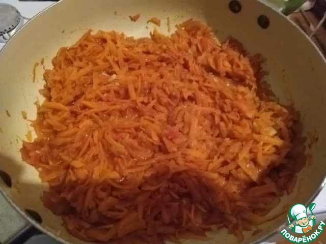 Готовим соус. Лук нарезать мелко, спассеровать на масле. Добавить натёртую морковь, измельчённый чеснок, соль, перец. Обжарить до полуготовности овощей. Отложить 2 столовые ложки для фарша.