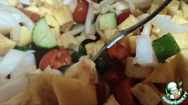 • Теперь режем на небольшие кусочки огурцы, помидоры и репу, режем лук.