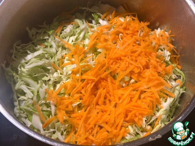 Капусту тонко нашинковал, морковку натер на крупной тёрке. А потом слоями выложил поверх утки. По чуть-чуть каждый слой присолил.