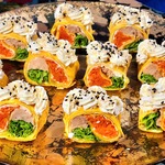 3. Беру два коржа, смазываю крем-сыром ( обильно), кладу внахлест друг на друга, на один край кладу морковь, сворачиваю один раз, затем кладу кусочки печени трески, еще раз сворачиваю и кладу листья салата, еще раз сворачиваю. Рулет нарезаю на порционные куски, с помощью кулинарного мешка отсаживаю крем-сыр на рулеты и украшаю белым и черным кунжутом.