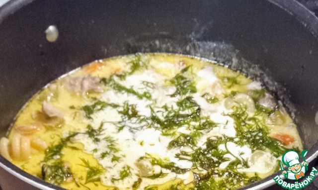 Увеличить огонь. В суп добавить пасту и куриные бедра. Довести его до кипения, затем слегка уменьшить огонь и варить 15 минут. Под конец влить пробитую блендером, отложенную смесь. Кожуру пармезана удалить. Она отдала супу все и больше не нужна. Посыпать укропом. Всем приятного аппетита!.