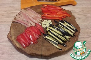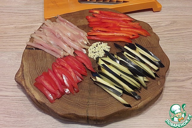 Овощи и курицу нарезать соломкой, чеснок измельчить
