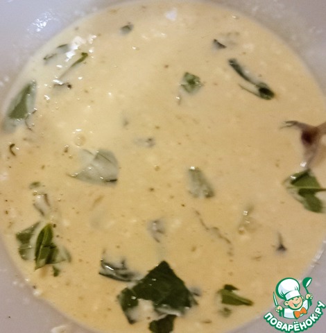 В салатнице смешать сливки, 3 яйца, сыр Фета и базилик. Посолить, поперчить.