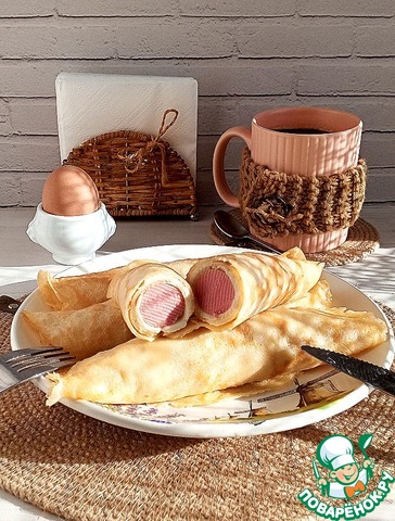 Блины можно приготовить заранее или накануне. Блины нужны тонкие и D~20-24 см, чтобы при термической обработке сыр не вытек из них. На блин выкладываем сыр в пластинах плавленный для бургеров. Поверх сыра, на его край, кладём сосиску и заворачиваем блин в рулетик.