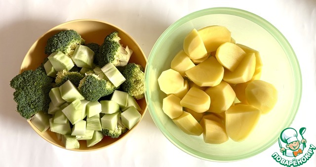 Картофель почистить и нарезать крупно, в зависимости от размера на 2/4 части. Брокколи разобрать на соцветия, промыть под проточной водой, кочерыжку почистить и нарезать на небольшие кубики.